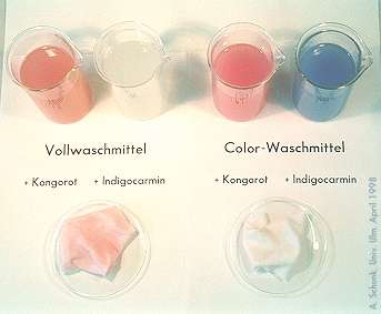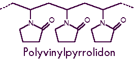 | Color-Waschmittel enthalten Polyvinylpyrrolidon (PVP, z.B. Sokalan HP 50®). PVP ist in Wasser und den meisten organischen Lösungsmitteln gut löslich und kann aufgrund seiner Polarität viele Substanzen binden. Beim Waschvorgang komplexiert PVP anionische Azofarbstoffe und verhindert damit das Aufziehen des Farbstoffs auf die Textilfaser. |   |